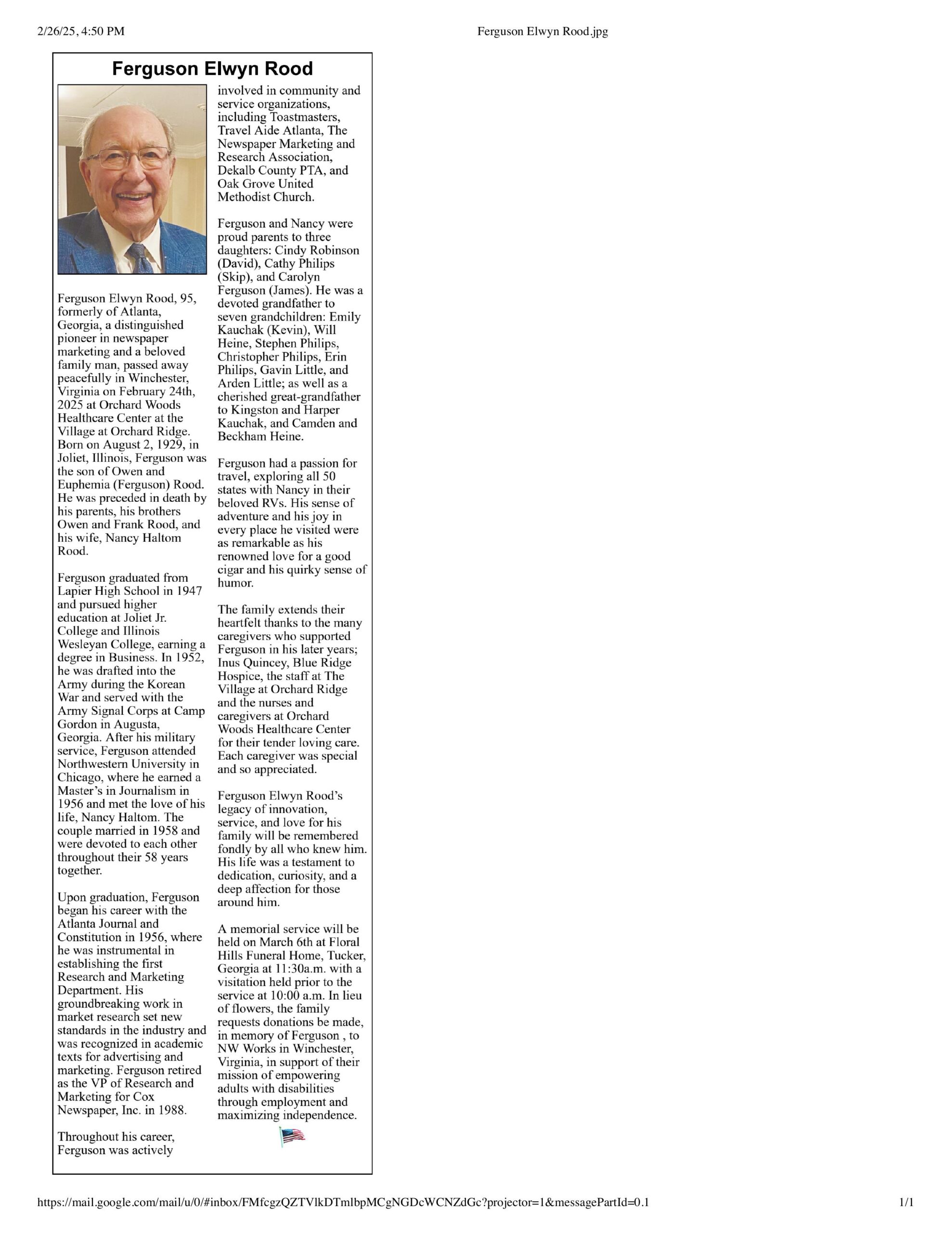 Ferguson Elwyn Rood ’59 recently passed away on February 24, 2025. He was involved in the community and service organizations include the Toastmasters. he was beloved by his family and many others and will be missed dearly. See his obituary below.