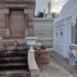 44% Catholic) which had mausoleums that we were told hosted only two coffins, holding the remains of the most recently-deceased member of the family. When a new death occurred, the old body was placed in a bag and returned to the tomb. All were above ground, since, our guide said, the water table is high and space is at a premium. (She noted the famous streetcars cannot turn around, but have two “fronts.” The driver goes to the other end at the end of the line. One track saves space).