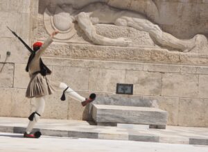 Poseidon and Athena has the Caryatids that support the roof, rather like the Museum of Science and Industry in Chicago. There’s also a temple to Athena Nike (victory) and another smaller temple at the entrance. The Acropolis was used by the Greeks, the Romans, then converted to a Church when the empire went Christian, then converted to a Mosque when the Turks conquered Greece, then reconverted to the Acropolis. One of the features we noted in London was the “Elgin Marbles” (saved from pollution and depredation, says the British Museum; stolen illegally, say the Greeks), the friezes that make up the story of the procession of Athena on the frieze at the Parthenon.