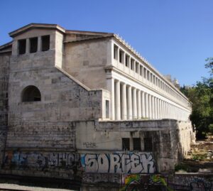 because I went to areas that I’d never been before, which are not really accessible by bus. The area is Monastiraki, an old monastery area at the base of the Acropolis, that is really the old town. One after another sights—the Roman baths, the library of Hadrian, the Tower of the Winds—all part of the ancient city artifacts, and all closed as of 3 pm. Can you believe that? Only one museum in the city is open after 3 pm….