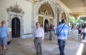 the 36 Sultans of the Ottoman Empire (1453-1923, though the family moved in the late 18th century to a more European palace in another part of the city). Having been to Windsor Castle, Versailles, and Potsdam, we’ve seen Western European castles and palaces. No one, however, except me, had seen the palaces in India (the Moghul forts at New Delhi and Agra) that are the closest equivalent of Topkapi—with the open pavilions, the gold and tile floral decorations—etc., that make me think of Scheherazade).